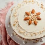 17. Decorate: Garnish the frosted cake with sliced and whole almonds around the sides and on top for an attractive presentation.