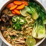 This Asian chicken noodle soup is a flavorful, light, and nourishing dish featuring tender shredded chicken, fresh vegetables, and aromatic seasonings in a delicate broth. It combines the umami depth of shiitake mushrooms and fish sauce with the brightness of lime and fresh herbs, perfect for a comforting meal any time of year.