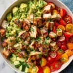 This Avocado Chicken Salad is a fresh, vibrant, and healthy dish featuring diced cooked chicken breast, ripe avocados, cherry tomatoes, cucumber, and cilantro, all tossed in a zesty lime and cumin dressing. Perfect for a light lunch or dinner, it combines creamy textures with bright, tangy flavors for a satisfying meal.