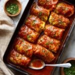 - Assemble Cabbage Rolls: Place one softened cabbage leaf on a clean surface. Spoon about ½ cup of the meat mixture onto the leaf, then fold the sides inward and roll tightly to enclose the filling. Place each roll seam-side down into the baking dish nestled in the sauce. Repeat until all filling and leaves are used.