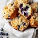 These bakery-style blueberry muffins are tender, moist, and topped with a buttery streusel for the perfect crunch. With a simple batter resting trick and a touch of sour cream, they deliver exceptional texture and flavor right in your own kitchen.