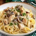 This classic Chicken Tetrazzini is a creamy, comforting Italian-American casserole featuring tender chicken, mushrooms, and spaghetti baked in a rich Parmesan-infused sauce. It combines sautéed onions and mushrooms with a velvety creamy sauce, tossed with pasta and chicken, then baked until golden and bubbly—perfect for a hearty family dinner.