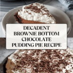 This Brownie Bottom Chocolate Pudding Pie is a decadent dessert featuring a fudgy brownie crust topped with rich homemade chocolate pudding and a fluffy whipped cream topping, finished with elegant chocolate curls. Perfect for chocolate lovers, this pie combines multiple textures and layers of deep chocolate flavor in a stunning presentation.