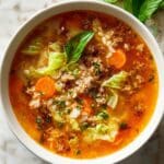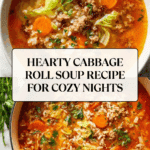 This hearty and comforting Cabbage Roll Soup combines all the classic flavors of traditional cabbage rolls in a warming, easy-to-make soup. Ground beef, green cabbage, carrots, and rice simmer in a flavorful tomato and beef broth base, enhanced with garlic, onions, and a hint of brown sugar for sweetness. Perfect as a satisfying meal during cooler days, this recipe brings all the deliciousness of cabbage rolls without the fuss of rolling.