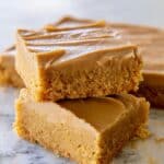 The image shows two square pieces of a dessert with two distinct layers. The bottom layer is a crumbly, golden-brown cake with a moist texture. The top layer is a smooth, light brown frosting with a glossy finish and a soft spread pattern. The upper piece is stacked slightly off-center on the lower piece, revealing the thick cake base beneath. The background is a white marbled texture with some crumbs scattered around the dessert. Photo taken with an iphone --ar 4:5 --v 7