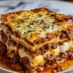A close-up of a three-layer lasagna slice on a white plate, showing a top layer of golden bubbly cheese sprinkled with small green herb pieces, the middle layers consist of brown ground beef mixed with melted creamy white cheese and tomato sauce, the bottom is a thick base of rich tomato sauce, all stacked evenly with visible textures of meat and cheese stretching slightly at the edges, set on a white marbled surface, photo taken with an iphone --ar 4:5 --v 7