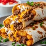 These cheesy potato burritos make for a comforting and satisfying meal, combining crispy tater tots with seasoned ground beef and melted cheese. Perfect for a family dinner or a cozy night in, they’re easy to prepare and full of flavor.