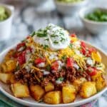 - Assemble dish: Once the potatoes are crispy and the beef is fully seasoned, layer the potatoes on a serving platter. Top with the seasoned ground beef, sprinkle generously with Mexican shredded cheese, and add optional toppings such as pico de gallo, guacamole, and sour cream to taste.