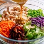A clear glass bowl sits on a white marbled surface, filled with many layers of colorful salad ingredients arranged separately in sections. On the left, there are small cubes of cooked chicken in light brown and white shades. Above the chicken, bright green chopped spring onions add freshness, next to shredded orange carrots. To the right, thin slices of purple cabbage form a neat pile, beside light tan almond slices. On the bottom right, there are dark brown crispy bacon pieces and fresh green leafy lettuce. A thick, golden-brown dressing is being poured into the center of the bowl, creating a smooth mound that starts to spread over the ingredients. photo taken with an iphone --ar 4:5 --v 7