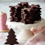 A white wavy-edge cake stand holds three stacks of dark brown chocolate cookies shaped like stars, Christmas trees, and snowmen, each stack having about five to six cookies neatly piled. In front of the stacks a single Christmas tree cookie is standing upright, showing its thickness and smooth texture. Behind the cookies, there is a spool of pink and white string partially visible. The background and surface have a soft white marbled texture with a hint of a pink-striped cloth underneath. photo taken with an iphone --ar 4:5 --v 7