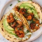 - Assemble the tacos: Place a scoop of cilantro lime slaw on each warmed tortilla, add 4-6 shrimp, spoon over some of the cilantro honey lime sauce, top with sliced avocado, and finish with a squeeze of fresh lime juice. Serve immediately and enjoy your fresh shrimp tacos!