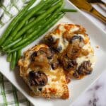 The image shows two pieces of cooked chicken breast topped with melted, bubbly white cheese, golden-brown sautéed onions, and dark brown mushrooms on a white square plate. The chicken has a slightly charred, crispy edge and is placed side by side in the middle right of the plate. On the left side of the plate, there is a neat stack of fresh green beans with a glossy texture. The plate is set on a white marbled surface, with a gold fork and knife placed diagonally in the upper right corner, and part of a checkered white and green cloth is visible in the upper left corner. Photo taken with an iphone --ar 4:5 --v 7