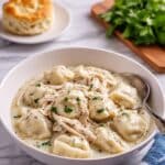 The image shows a white bowl filled with creamy chicken and dumplings. The dish has two main layers: thick, tender dumplings with a smooth, pale beige sauce and shredded pieces of light brown chicken mixed evenly throughout. The sauce has a slight gloss and is speckled with black pepper. In the background, there is a white plate with two golden-brown biscuits on a blue and white striped cloth, and fresh green cilantro leaves on a wooden board. The whole scene is set on a white marbled surface. photo taken with an iphone --ar 4:5 --v 7