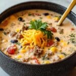 A hearty and flavorful Creamy Cowboy Soup featuring ground beef, potatoes, black beans, corn, and smoky spices simmered to perfection with cream and cheddar cheese for a comforting meal.