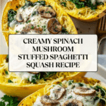 This Creamy Spinach and Mushroom Stuffed Spaghetti Squash recipe is a delicious, comforting vegetarian dish that combines tender roasted spaghetti squash with a rich, creamy blend of sautéed mushrooms, fresh spinach, garlic, and cheeses. Perfect as a healthy main course or an impressive side, this recipe balances wholesome ingredients with indulgent flavors in a satisfying, easy-to-make meal.