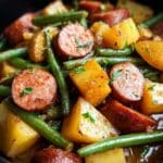 - Prepare Ingredients: Slice the kielbasa into 1-inch pieces, trim the fresh green beans if using, halve the baby potatoes, chop the onion, and mince the garlic cloves.