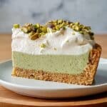 A slice of pie with three clear layers sits on a white plate with a wooden base. The bottom crust layer is thick, crumbly, and golden brown. Above it is a smooth, dense middle layer of pale green with tiny black specks. The top layer is creamy white whipped topping that looks soft and light, sprinkled with chopped green pistachio nuts. The pie slice is set against a white marbled texture background. Photo taken with an iphone --ar 4:5 --v 7