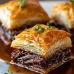 French Dip Squares are a delicious, easy-to-make appetizer that combines tender roast beef and melted Swiss cheese between layers of flaky crescent rolls. Served with warm beef broth for dipping, these squares bring the classic sandwich flavor in a fun, shareable form.