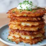 A tall stack of six golden brown, crispy potato pancakes is on a white plate with a light blue tint, each pancake showing uneven, crunchy edges and a crispy, textured surface. On the top pancake, there is a dollop of white sour cream topped with small chopped green chives. The stack sits on a wooden table with a soft white marbled texture in the background. photo taken with an iphone --ar 4:5 --v 7