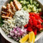 - Assemble the bowls: In serving bowls, place a bed of rice or quinoa, then top with shredded romaine lettuce, grape tomatoes, cucumber, red onion slices, sliced chicken breasts, crumbled feta cheese, and a generous dollop of the tzatziki sauce. Serve immediately for a fresh, flavorful meal.
