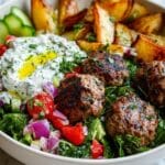 A delicious and hearty Greek Meatball Bowl featuring tender homemade beef meatballs, crispy roasted potato wedges, vibrant Greek salad, and refreshing tzatziki sauce. This recipe combines traditional Greek flavors and fresh herbs to create a wholesome and satisfying meal perfect for lunch or dinner.