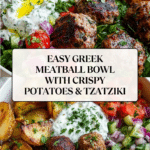 Keywords: Greek meatballs, tzatziki sauce, roasted potatoes, Greek salad, Mediterranean bowl, healthy dinner, homemade meatballs