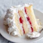 A slice of white cake with three layers of soft, light yellow sponge is shown on a white plate. Between each sponge layer, there is a thin layer of bright red jam and a layer of white whipped cream. The outside of the cake is covered in thick, fluffy white whipped cream with a textured and slightly uneven surface. A white spoon with some cake crumbs on it rests beside the slice on the plate. The scene is set on a white marbled background. photo taken with an iphone --ar 4:5 --v 7