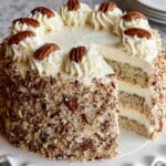 11. Step 11: Frost each cake layer, sprinkling with reserved toasted pecans in between. Add the final layer and frost the top and sides.