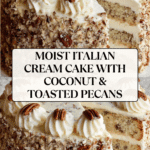 Italian Cream Cake is a rich, moist, and flavorful layered cake made with a blend of buttermilk, toasted pecans, and sweetened coconut. This classic Southern dessert is frosted with a luscious cream cheese and buttercream mixture, then decorated with toasted coconut and pecans for a perfect balance of texture and taste. Ideal for special occasions and celebrations.