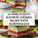 Classic Italian Rainbow Cookies featuring layers of almond-flavored sponge in vibrant red, white, and green, sandwiched with raspberry jam and coated in rich semisweet chocolate. These colorful, festive treats combine delicate textures and flavors for a delightful holiday or special occasion dessert.