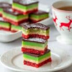 A stack of three colorful layered square bars is placed on a white plate with a delicate embossed rim, set on a white marbled surface. Each bar has four layers: a bright red crumbly bottom layer, a thin golden beige middle layer, a vibrant green cake-like layer above it, and a smooth, glossy dark chocolate layer on top. The top bar has a bite taken out of the corner, showing the texture inside. In the background, more similar bars are arranged in a white rectangular dish, dusted lightly with powdered sugar on the top chocolate layer. On the side, a white cup with a pattern of red reindeer near the rim is partially visible. Photo taken with an iphone --ar 4:5 --v 7