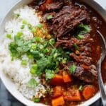 This Korean Style Pot Roast is a flavorful and hearty dish combining tender chuck roast with aromatic garlic, ginger, and a savory-sweet blend of Korean chili paste, soy sauce, and brown sugar. Slow-braised in a Dutch oven to perfection, it’s served with carrots and garnished with fresh green onions and cilantro, making it a comforting meal perfect for any occasion.