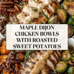 Keywords: maple Dijon chicken, sweet potato bowls, roasted Brussels sprouts, healthy chicken bowl, maple mustard glaze, fall recipe, brown rice bowls, easy dinner