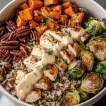 - Assemble the Bowls: Divide the cooked rice into serving bowls. Slice the grilled chicken breasts and arrange on top. Add the roasted sweet potatoes and Brussels sprouts alongside. Drizzle with the maple mustard sauce evenly over each bowl.
