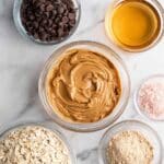 - Combine Ingredients: Add the no stir creamy peanut butter, honey, rolled oats, vanilla protein powder, salt, and mini dark chocolate chips into a mixing bowl. Use a rubber spatula to thoroughly mix all ingredients until the batter is fully combined.