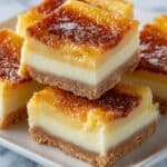 The image shows four square pieces of a dessert with three visible layers: a crumbly light brown crust at the bottom, a thick creamy yellow middle layer, and a golden brown caramelized top layer with a slightly cracked texture. The pieces are arranged on a white plate sitting on a white marbled surface. The top layer has a shiny, sugary finish, and the edges of each piece show the clear division of the layers. Photo taken with an iphone --ar 4:5 --v 7