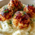 Parmesan Cloud Chicken Bombs are tender, flavorful baked chicken meatballs enriched with a creamy Parmesan and mozzarella sauce. These bite-sized delights combine ground chicken with garlic, herbs, and spices, baked to golden perfection, then finished under the broiler with a rich, cheesy sauce. Served over mashed potatoes or cauliflower purée and garnished with fresh herbs, this comforting dish is perfect for a cozy dinner with a touch of elegance.