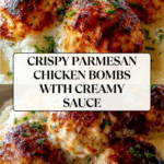 - Broil the Chicken Bombs with Sauce: Transfer the baked chicken bombs into a small casserole dish. Pour the prepared Parmesan sauce evenly over the top. Place under the broiler for 3 to 5 minutes, or until the sauce is bubbly and the top is lightly golden.