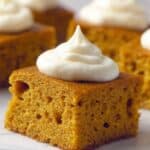 8. Frost the Bars: Spread the cream cheese frosting evenly over the completely cooled pumpkin bars using a spatula. Once frosted, cut into squares and serve.