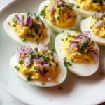 Delightfully tangy and creamy, Pickled Onion Deviled Eggs offer a flavorful twist on the classic appetizer by incorporating vibrant pickled onions into the rich egg yolk mixture, garnished with fresh chives for an elegant finish.