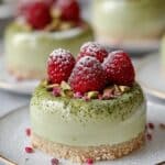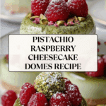 These Pistachio & Raspberry Cheesecake Domes combine creamy pistachio cheesecake with a tart raspberry center for a delightful dessert experience. Finished with a shiny mirror glaze and garnished with fresh raspberries and crushed pistachios, they’re sure to impress any guest.