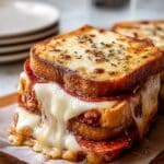 This Pizza Grilled Cheese is a delicious fusion of two beloved comfort foods—pizza and grilled cheese sandwich. Made with buttery toasted bread, gooey melted mozzarella and Parmesan cheeses, zesty marinara sauce, and savory turkey pepperoni, this sandwich offers all the flavors of a classic pizza in a convenient handheld form. Perfect for a quick lunch or cozy snack, it’s easy to prepare on the stovetop and customizable with your favorite pizza toppings and fresh herbs.