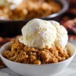 - Bake the crisp: Place the skillet in the preheated oven and bake for 40 to 45 minutes, or until the pumpkin filling is set and the topping is golden brown. If the crumb topping browns too quickly, lightly cover the top with aluminum foil to prevent further browning.
