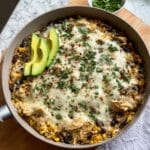This Salsa Verde Chicken & Rice Skillet is a flavorful and hearty one-pan meal combining tender shredded rotisserie chicken with vibrant salsa verde, black beans, corn, and aromatic spices. Cooked on the stovetop, the rice absorbs all the delicious flavors, topped with melted Monterey Jack cheese and fresh cilantro for a comforting and easy dinner.