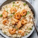 - Garnish and serve: Top bowls of risotto with thinly sliced green onions just before serving. Enjoy your shrimp risotto warm.