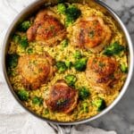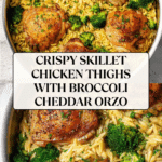 Keywords: chicken thighs, broccoli cheddar orzo, skillet chicken, one pan dinner, easy chicken recipe, comfort food