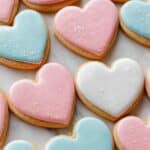 A close-up view of many heart-shaped cookies each with two layers: a light golden brown base cookie and a smooth icing top layer. The icing colors vary between soft pink, pale blue, and pure white, all with a slightly shiny texture and small white sugar crystals sprinkled on the pink and blue ones. The cookies are placed close together on a white marbled surface, showing slightly rounded edges and a soft, even finish on the icing. The image captures the uniform thickness of both the cookie base and the icing layer, creating a clean and bright look. Photo taken with an iphone --ar 4:5 --v 7