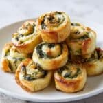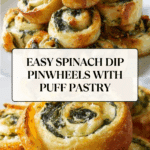 Keywords: spinach dip pinwheels, puff pastry appetizer, bite-sized snacks, party appetizers, spinach cream cheese roll-ups