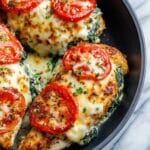 This Spinach Stuffed Chicken Breast recipe features tender chicken breasts filled with a creamy mixture of fresh spinach, garlic, cream cheese, and mozzarella. The chicken is first seared to a golden brown in a cast iron skillet, then baked to perfection in the oven, topped with fresh tomato slices and melted mozzarella for a flavorful and hearty meal.
