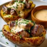 Deliciously hearty Steak-Stuffed Baked Potatoes topped with a rich Parmesan Cream Sauce. Tender cubes of seared sirloin steak are nestled inside crispy baked Russet potatoes, then drizzled with a velvety homemade Parmesan cream sauce and garnished with fresh parsley for an irresistible meal.